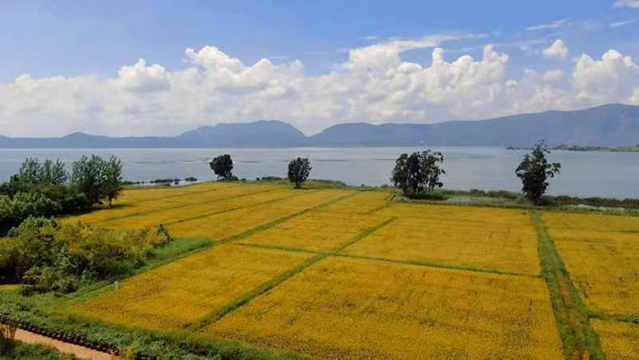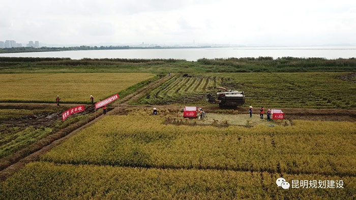 负责种植管理的云南启山农业发展有限公司相关负责人介绍,这是滇池宝丰湿地内农田第一次大规模种植水稻,去年曾经小范围试种,今年初启山农业公司在省农业农村厅、省农科院的支持下,引入优质水稻品种,在滇池畔进行大规模种植,并同步投放了12吨本地鱼类,放入田里发展稻田养鱼。现在已经稻熟鱼肥双丰收。