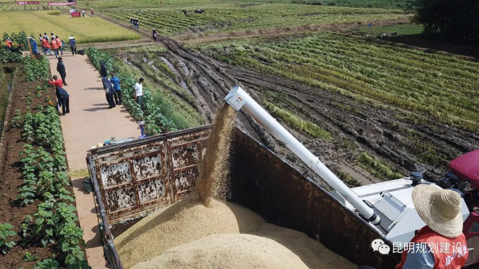 通过随机抽取近4亩稻田进行测产,平均亩产600余千克,低于其他地区普通稻田平均800余千克的亩产量。这是因为这里有滇池湿地,采用生态种植方式,种植密度低,不能使用农药、化肥等,因此不刻意追求产量。