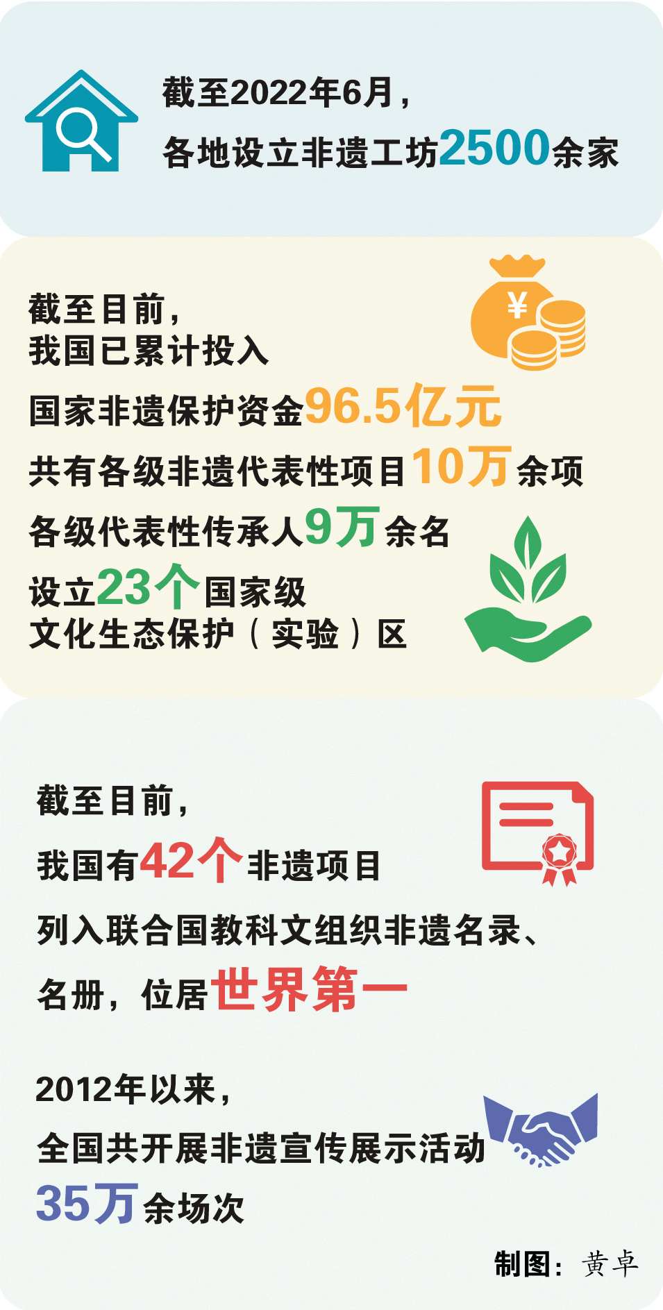 截至目前,我国共有各级非遗代表性项目10万余项,其中国家级非遗代表性项目1557项;各级代表性传承人9万余名,其中国家级非遗代表性传承人3062名。设立23个国家级文化生态保护(实验)区,非遗传承活力不断增强。