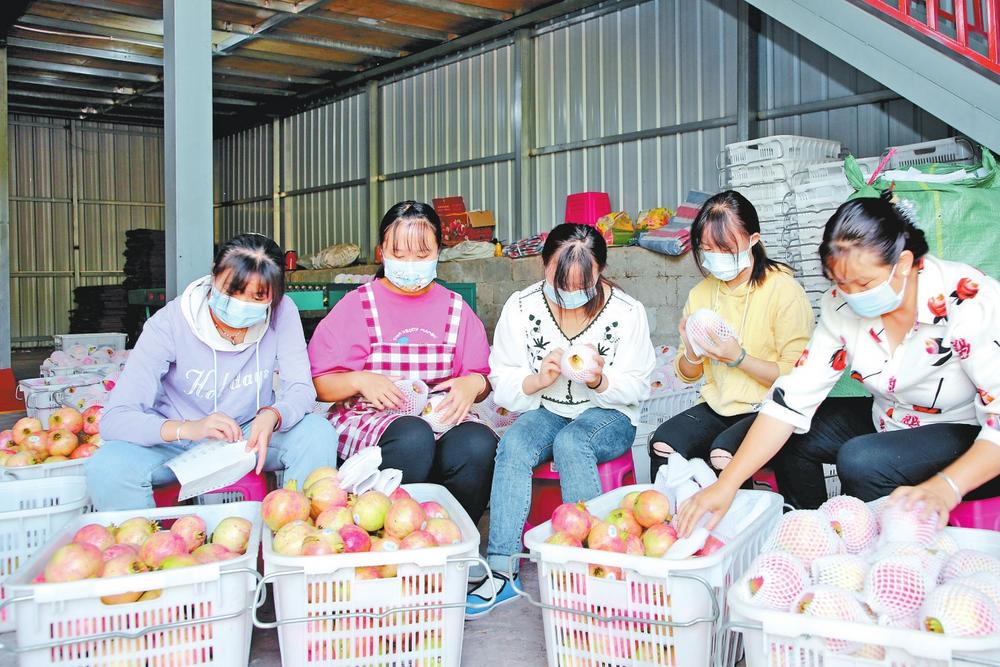 在梦之榴专业种植合作社的石榴分拣中心,80余名务工群众正忙着初选、分级、打包,仓库内打包成箱的石榴准备启程外运。合作社负责人雷智淞介绍,合作社除了销售自己的石榴,还帮助附近村民代销,务工群众每天能有100多元的收入。