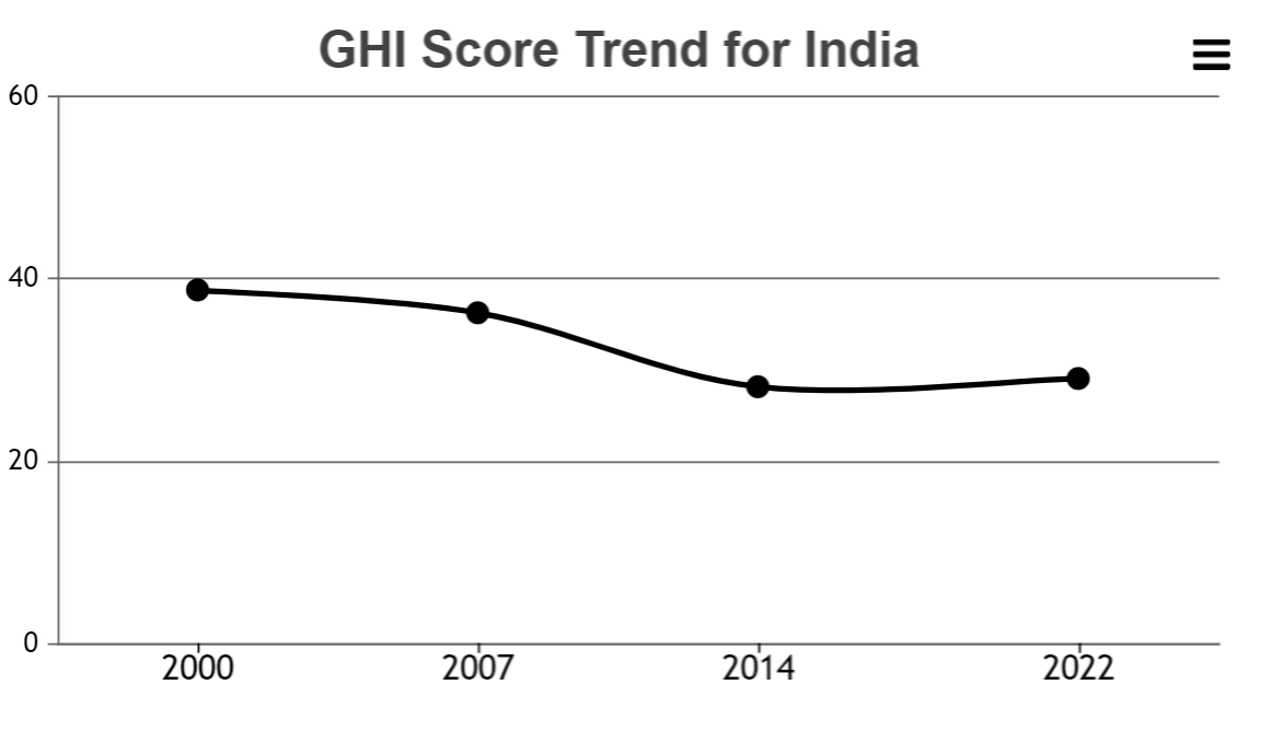 2000年、2007年、2014年以及2022年,印度GHI得分比较。图/全球饥饿指数官网截图