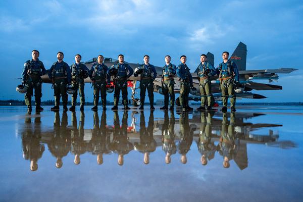 2018年9月,空军“强军先锋飞行大队”飞行员在驾驶过的战鹰歼-11B前合影。摄影:万全