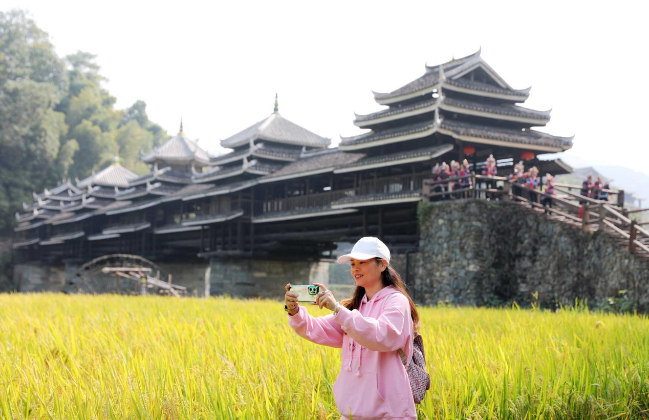程阳八寨侗族风情浓厚,侗寨民居、桥梁基本都是木构建筑,独具特色。永济桥是程阳八寨的标志性建筑,整座桥梁不用一钉一铆,均是榫卯相连。秋日里独特的侗寨风光引来不少游客前来游玩。(央广网 记者罗兰)