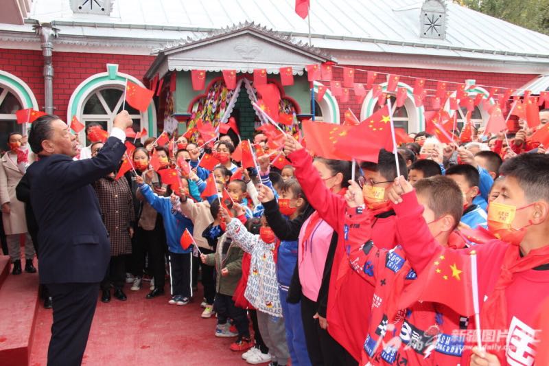 塔城市新城街道哈尔墩社区居民沙勒克江·依明在自家小院里同各族群众一起升国旗,唱爱国主义歌曲。通讯员 马合巴勒·木尔扎汗摄