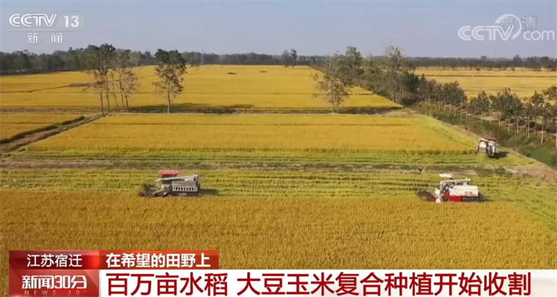 水稻开镰收割的同时,泗洪的大豆玉米带状复合种植迎来丰收。在泗洪县金锁镇,今年,玉米、大豆总种植面积在30000亩左右,其中大豆玉米带状复合种植在5000亩左右,目前全部进入收割期,整体长势良好。