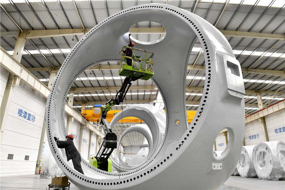 在山东省惠民县风电装备产业基地涂装车间,工作人员对风电轮毂进行涂装(2022年6月7日摄)。新华社记者 郭绪雷 摄