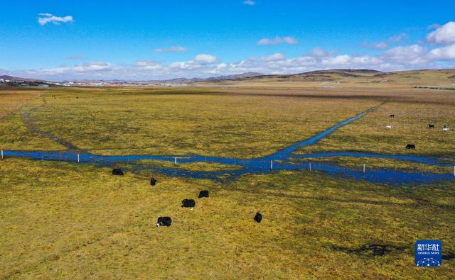 这是10月17日在四川省阿坝藏族羌族自治州阿坝县拍摄的漫泽塘湿地景色(无人机照片)。 深秋时节,四川省阿坝藏族羌族自治州境内的大片湿地景色壮美。作为黄河上游重要水源涵养地,近年来,当地采取护湿还水,禁牧还草等生态修复治理措施,全力推动黄河上游生态保护,境内湿地生态环境得到持续改善。 新华社记者 王曦 摄