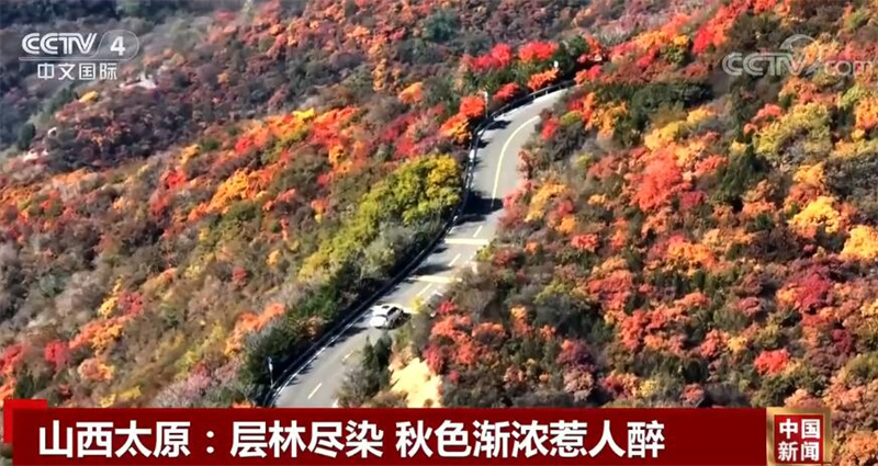 眼下正值红叶最佳观赏期,位于山西太原的龙山城郊森林公园层林尽染,秋韵正浓。从空中俯瞰,漫山遍野的秋色树种或红、或黄、或绿,为群山披上五彩外衣,构成一幅绝美秋色图。
