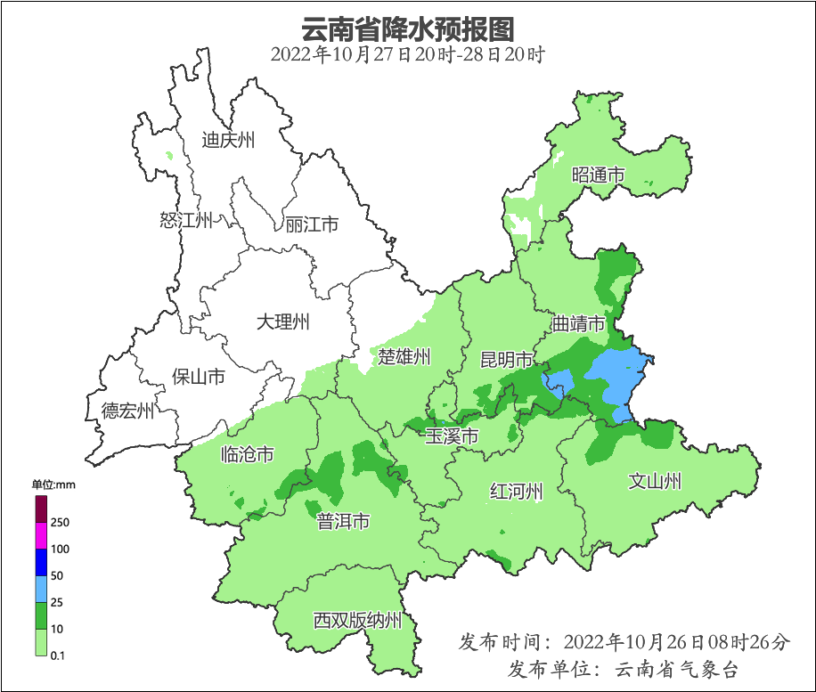 受降雨影响,10月26日20时到10月27日20时,怒江州西北部局部区域发生滑坡泥石流的风险高;迪庆州西北部,怒江州西北部、北部,大理州中部局部区域发生滑坡泥石流的风险较高。