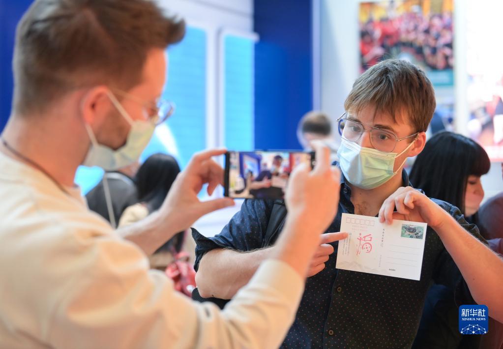 10月27日,外国嘉宾在互动体验展台前拍摄在明信片上盖的印戳。新华社记者 李贺 摄