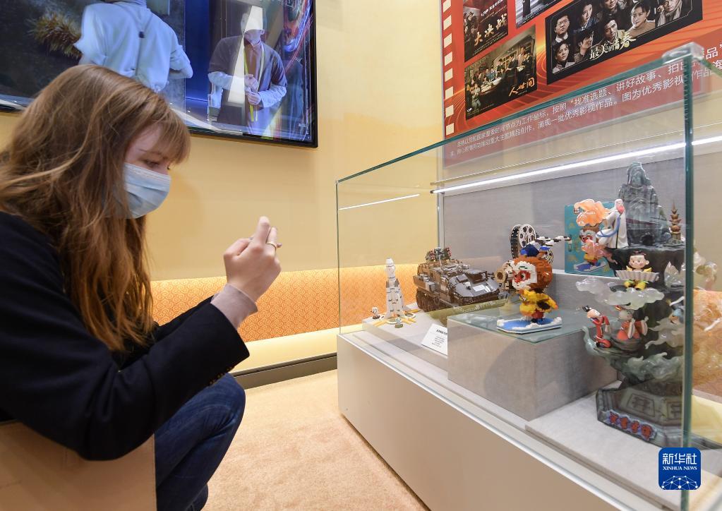 10月27日,外国嘉宾在参观“奋进新时代”主题成就展时拍摄展柜内的卡通玩具。新华社记者 李贺 摄
