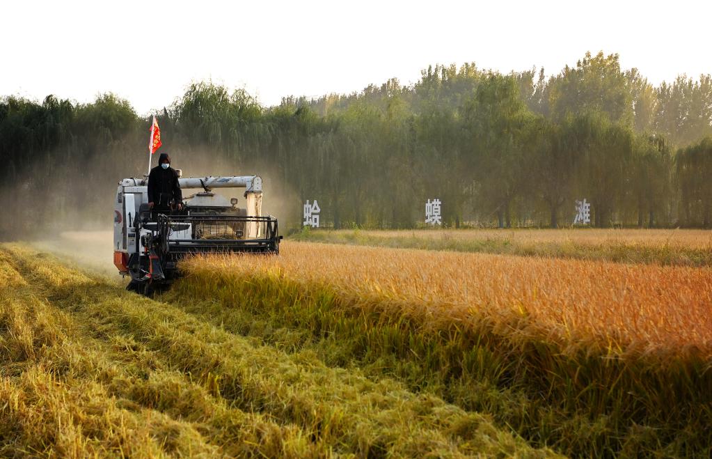 在西安市长安区王曲街道皇甫村,村民驾驶收割机收割水稻。新华社记者 刘潇摄