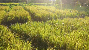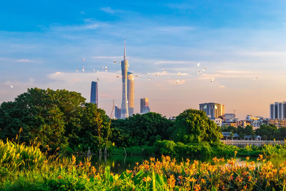 夕照下广州海珠湿地水稻田与不远处璀璨城市天际线相映(2020年7月25日摄)。