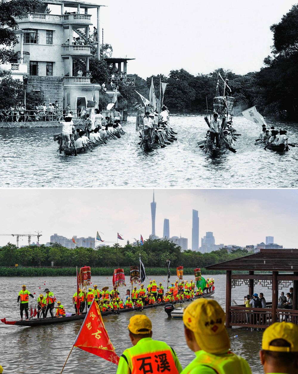 这是一张拼版照片:上图是1982年,位于现在广州海珠湿地范围内的龙潭村村民在端午前后斗龙舟(资料照片);下图是2019年6月6日拍摄的广州海珠湿地端午划龙舟场景(新华社记者刘大伟/摄)。