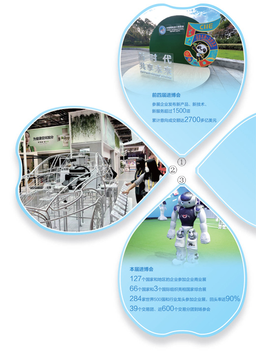 图①:在国家会展中心(上海),“新时代,共享未来”主题景观格外醒目。本报记者 强 薇摄