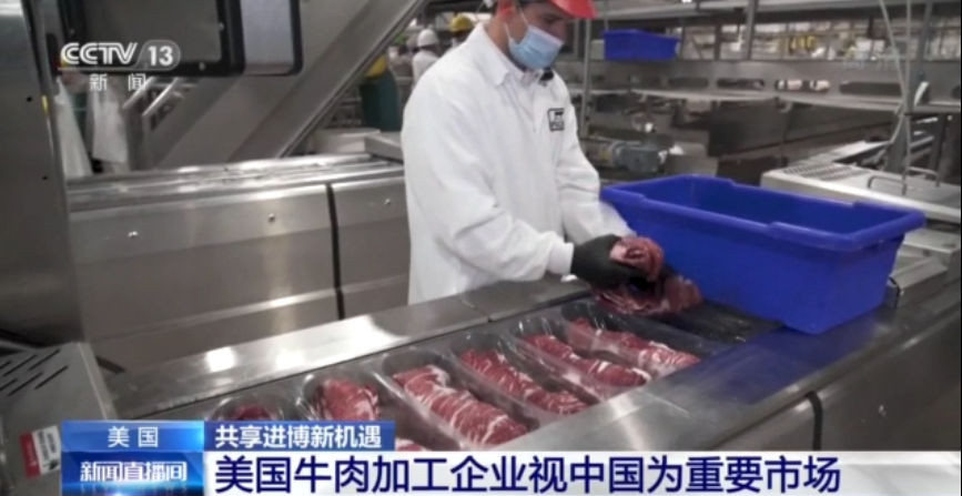 央视记者 许弢:加州的这家牛肉加工厂是美国为数不多向中国出口牛肉的工厂之一,每年他们向海外出口牛肉的数量占生产总额的35%左右。而在这其中,大多数牛肉都销往中国。今年,他们带着自己的产品首次走进进博会。