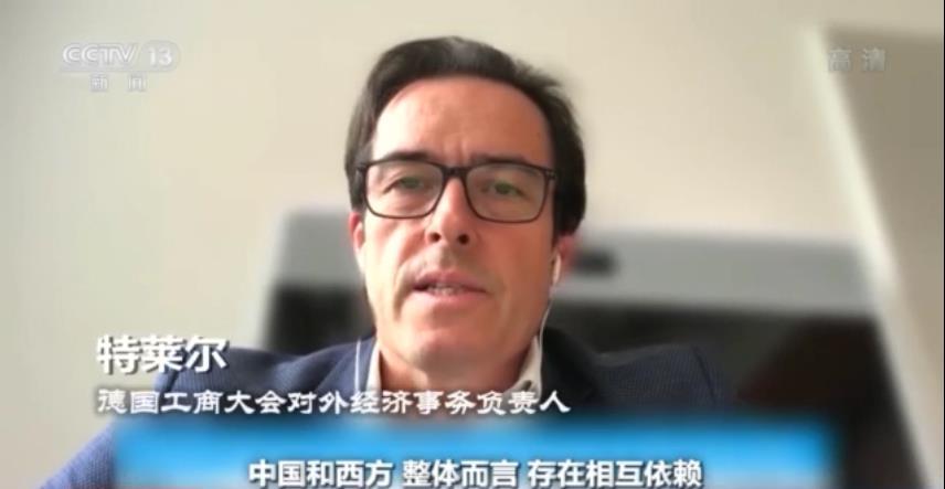 德国工商大会对外经济事务负责人 特莱尔:中国和西方,整体而言,存在相互依赖,而不单只是德国企业(依赖中国),这是迈向公平竞争环境的下一步。从另一方面来说,它保障了德国的商品顺利进入中国市场,我们(也)非常需要中国的商品尤其在眼下供应链被严重扰乱的时刻。