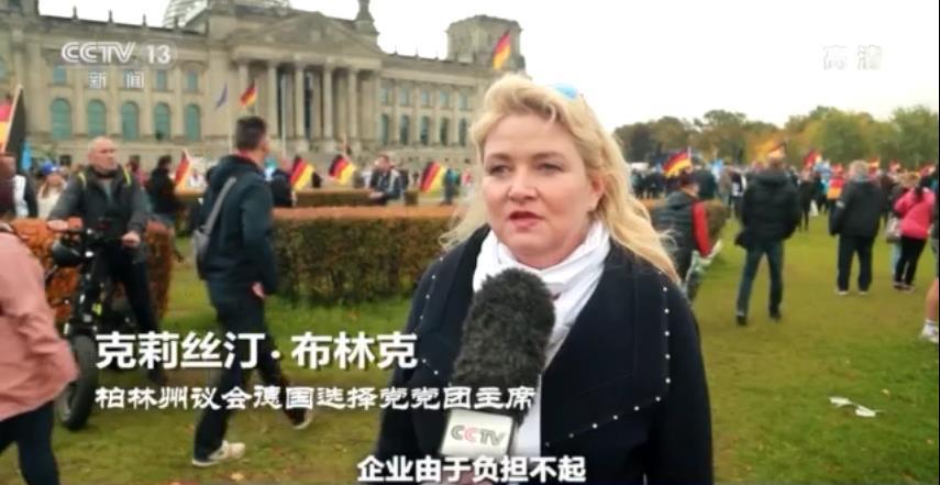 柏林州议会德国选择党党团主席 克莉丝汀·布林克:德国的能源安全没有保障,大家不知道该如何维持生计,企业由于负担不起高能源成本而倒闭等等,这一切都对我们的国家产生巨大影响。