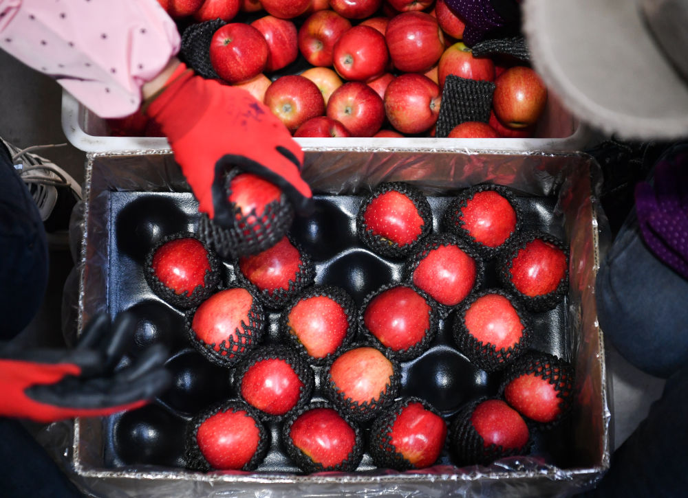 10月10日,工作人员在陕西延安市洛川县一家果业公司打包苹果。新华社记者张博文/摄