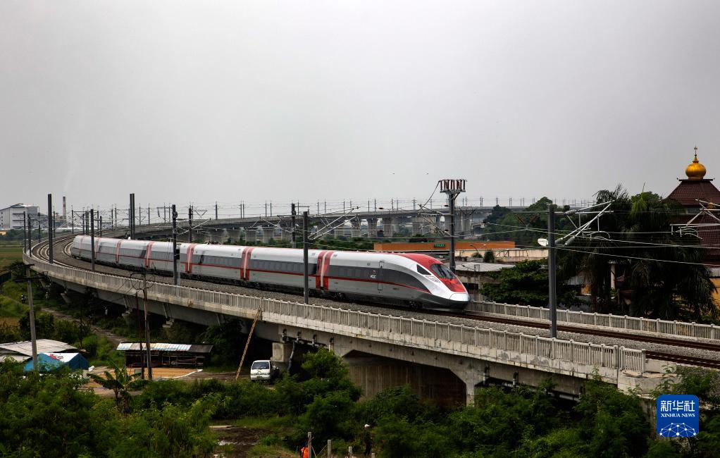 11月9日,在印度尼西亚西爪哇省万隆市,一列高铁动车组正在雅万高铁试验段进行热滑试验。新华社发(焦宏涛摄)