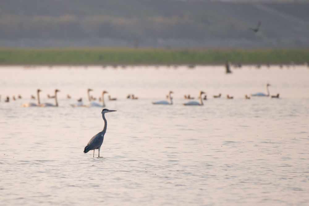 ↑11月10日,一只苍鹭在湖南西洞庭湖湿地水面休憩。