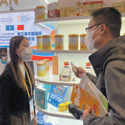 11月7日,食品与农产品展区,哈萨克斯坦展台工作人员向零售商介绍天然果脯。记者曲颂/摄