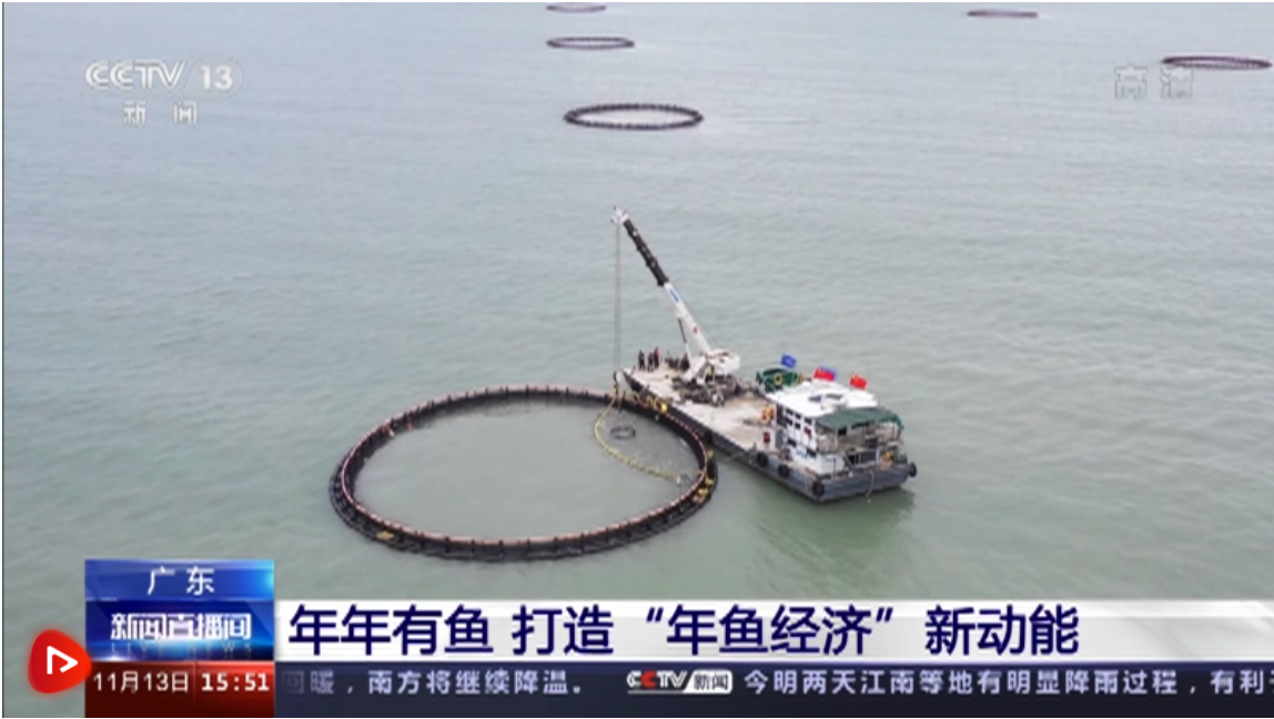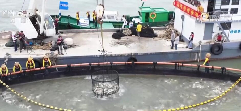 在广东湛江的一处海上养殖基地,随着船上的吊臂缓缓升起,鱼圈内的大网慢慢收紧,大量的金鲳鱼在水面跳动。