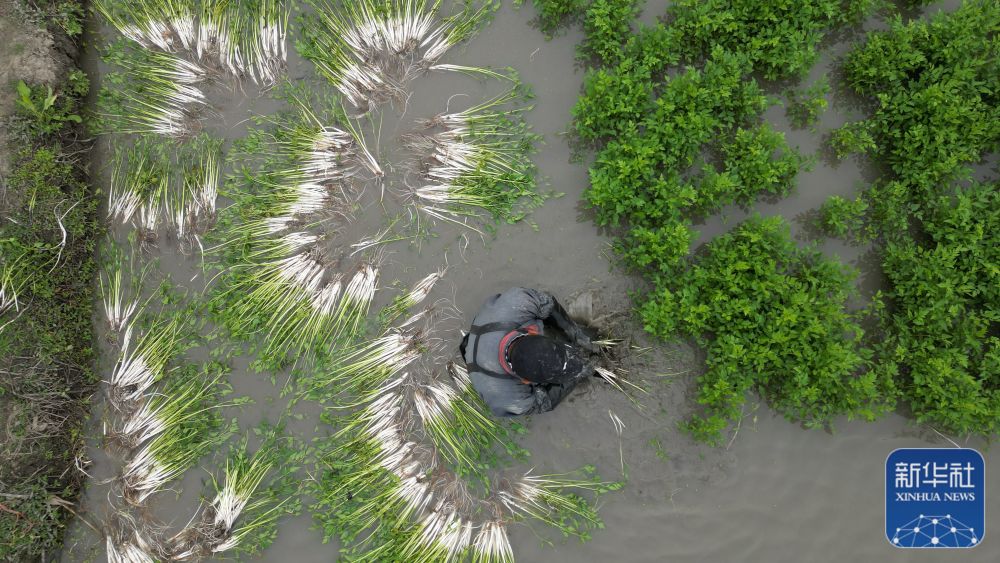 11月14日,江苏省太仓市双凤镇勤力村“水八仙”蔬菜种植基地,菜农在采收水芹菜(无人机照片)。新华社发(计海新 摄)