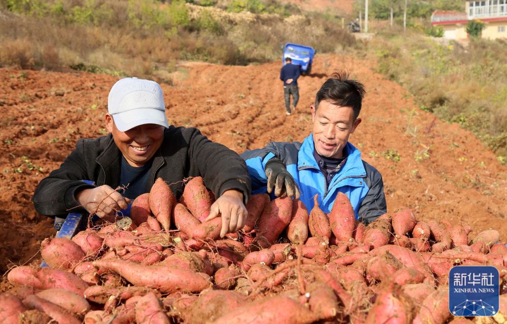 11月14日,河南省洛阳市汝阳县刘店镇二郎村农民在薯田收获红薯。新华社发(康红军 摄)