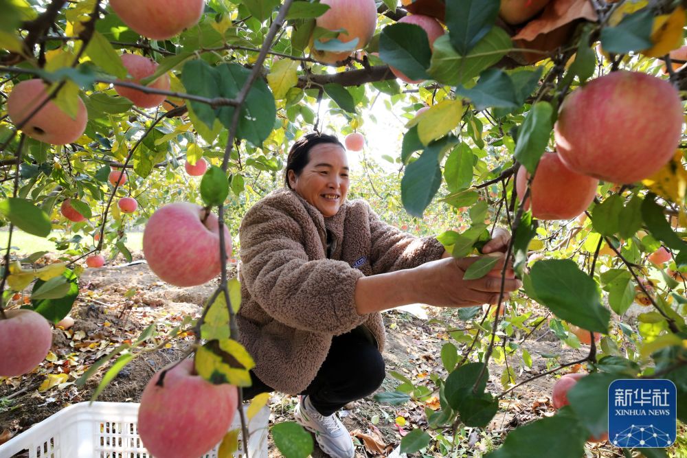 11月15日,山东省临沂市郯城县郯城街道王集村村民在采摘苹果。新华社发(张春雷 摄)