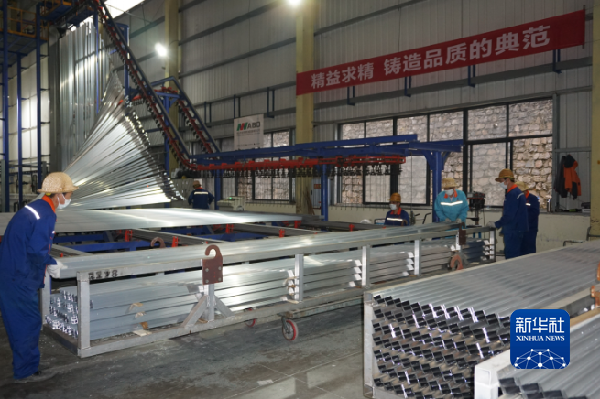 工人在铝合金表面喷涂处理线上进行型材的表面处理。(受访者供图)
