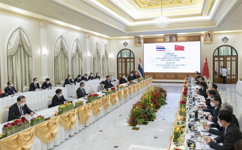习近平指出,双方要像走亲戚一样常来往、多走动,在涉及彼此核心利益和重大关切问题上继续相互坚定支持。双方要落实好未来5年《中泰战略性合作共同行动计划》,统筹推动各领域合作取得更多成果。要有效对接各自发展战略,推动高质量共建“一带一路”不断取得新成效。双方要加强投资、贸易、旅游、基础设施、产业园等传统领域合作,同时不断培育新增长点,推动数字经济、新能源汽车、科技创新等新领域合作取得积极进展。要加快中老泰三方铁路合作,积极推进“中老泰联通发展构想”,重点加强基础设施“硬联通”,做好物流通关“软联通”,扩大泰国优质农副产品输华。中方愿同包括泰国在内的各方一道,高质量实施《区域全面经济伙伴关系协定》,让这一全球最大自贸区安排释放更大红利。加大打击跨境犯罪,深化追逃追赃合作。加强教育、医疗、扶贫等民生领域合作,通过多种方式交流减贫发展经验,推动两国扶贫合作走深走实,办成、办好一批贴近群众、服务基层的实事。要加强青年交流,使两国人民心更近、情更深,丰富中泰命运共同体的人文内涵。