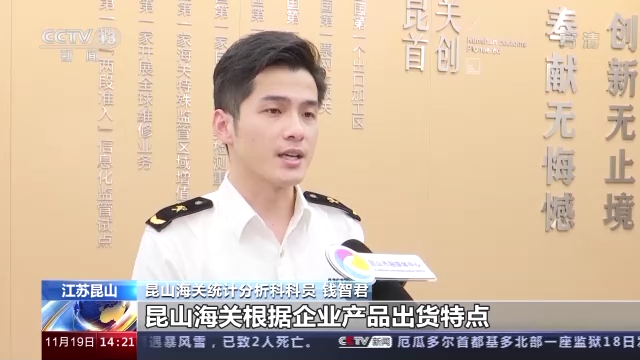 昆山海关统计分析科科员 钱智君:昆山海关根据企业产品出货特点,完善24小时预约放行、进出区卡口支持等措施,充分发挥昆山综保区物流分拨中心作用,指导企业充分运用分送集报、汇总征税等模式保障企业快速通关。