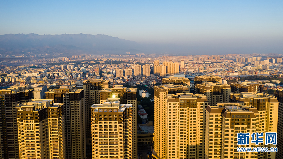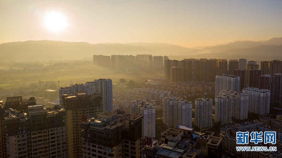 航拍晨曦里的云南蒙自 湖光山色映朝阳