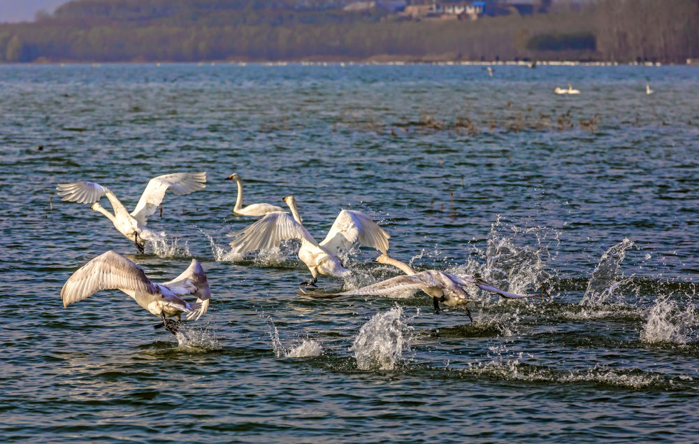 占地6000多公顷的山西平陆黄河湿地位于山西、河南两省交界处,这里冬季气候温和,采食丰富,非常适宜白天鹅越冬。每年秋末冬初,野生白天鹅都会从遥远的西伯利亚来到这里越冬。