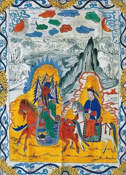 其实,蒙古人早在金元交替之际就已接触到关公信仰,鉴于解州池盐对国家财政的重要性,他们很自然地延续了宋、金两朝在崇奉盐神关公这件事上的做法。待蒙古人凭借其空前的武功入主华夏、建立元朝之后,勇武过人的战神关公对他们来说定然有着独特的魅力。史料记载,元代宫廷举行的盛大佛事法会“游皇城”,抬关公神像是其中的重要环节。全国各地开始普遍建立关王庙,元大都城的民众受上层统治者的影响,也在端午节举行盛大的赛关王会。到了明后期,崛起于东北的清朝统治者将其与蒙古上层的关系比作是刘备与关羽,一来是以关羽的特殊地位笼络对方,二来则是利用关羽的忠义精神羁縻蒙古。清代,伴随着内地的驻屯官兵、旅蒙商人、垦荒民众拖家携口地来到蒙古地区,供奉战神、财神关公的庙宇也越来越多地出现在蒙古高原上,在归化城、恰克图、乌里雅苏台等城镇都建有关帝庙。由此可见,骑马关老爷造像中出现蒙古文对联并不令人意外。