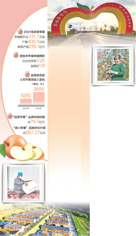 2012年至2021年,延安苹果产值增长最快,年均增长14.3亿元。靠着这颗奋斗果,10年间,全市农民人均纯收入从5250元增加到9688元。