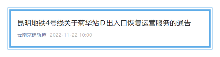 11月22日,云南京建轨道交通投资建设有限公司发布关于菊华站D出入口恢复运营服务的通告,详情如下: