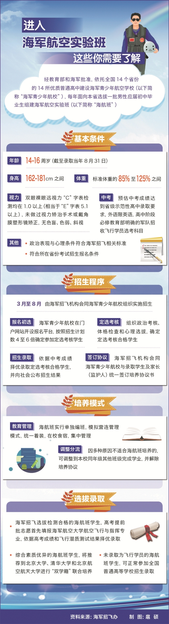 “随着人民海军走向深蓝的航迹不断延伸,对飞行人才特别是航母舰载机飞行员的迫切需求前所未有。”海军招收飞行学员工作办公室(以下简称“海军招飞办”)负责人介绍,为了加快飞行人才队伍建设,他们前伸招飞关口,从过去高中毕业阶段提前到如今初中毕业阶段,立足一所重点学校,选拔全省优秀苗子,海军招飞的选才面和辐射面明显扩大。