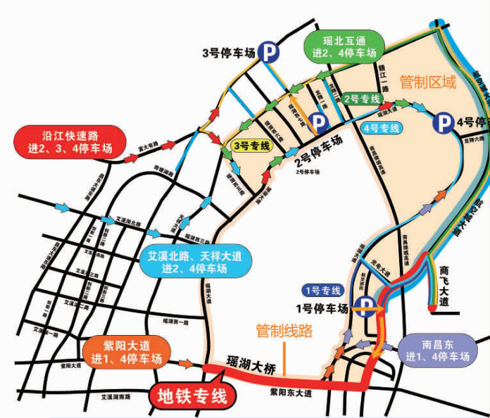 2、瑶湖西六路、瑶湖西七路的天祥北大道口至沿江快速路口段、龙翔一路(宏光二路)的瑶湖大道口至规划路口段、龙翔二路(宏光一路)禁止机动车辆向沿江北快速路通行(“大会”公交接驳车辆除外);