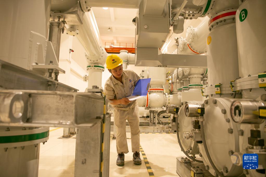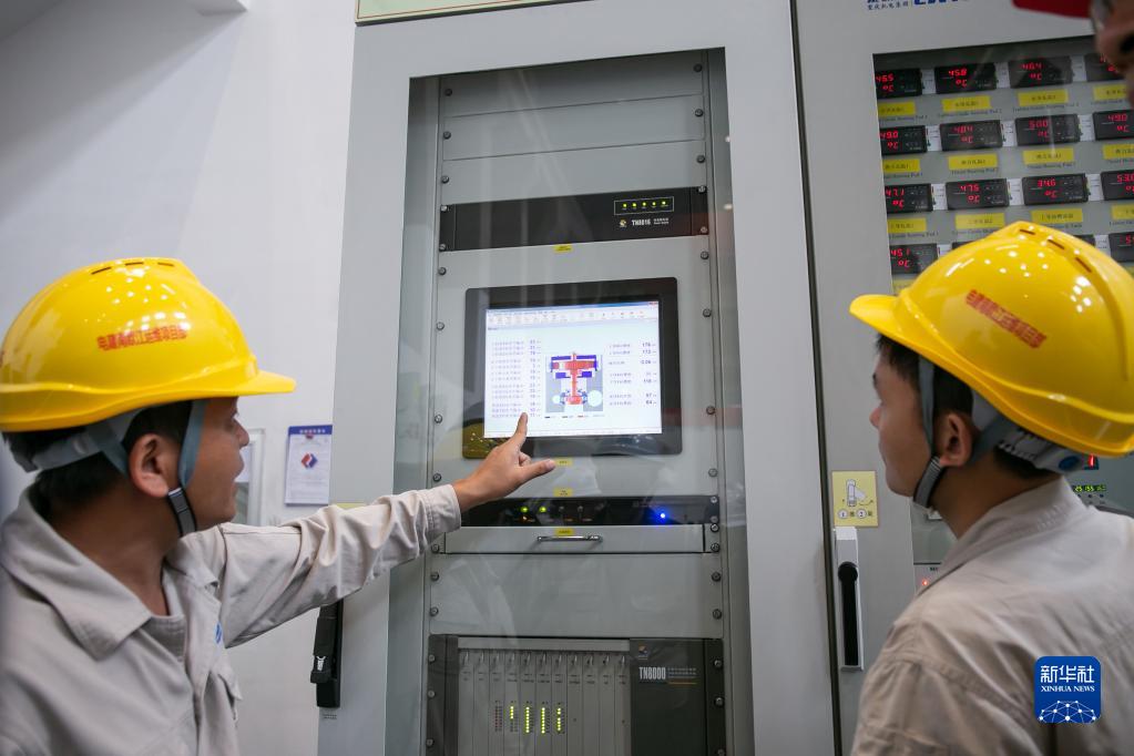 2022年9月27日,在老挝北部丰沙里省,中国电建南欧江流域梯级水电项目七级电站的工作人员检查运营情况。新华社发(凯乔摄)