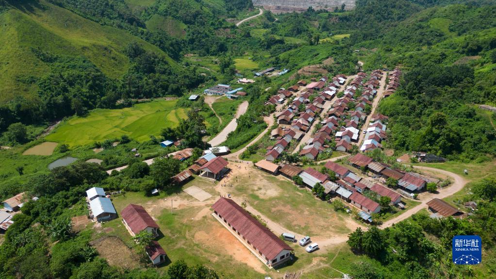 这是2022年9月27日在老挝北部丰沙里省航拍的中国电建南欧江流域梯级水电项目七级电站附近的移民新村。新华社发(凯乔摄)