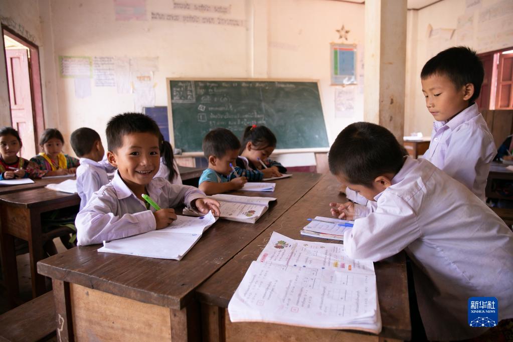 2022年9月27日,在老挝北部丰沙里省,孩子们在中国电建南欧江流域梯级水电项目七级电站附近的移民新村里上学。新华社发(凯乔摄)