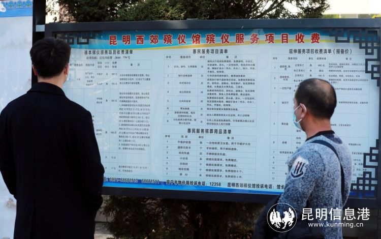 昆明西郊殡仪馆建立了基本殡仪服务项目收费清单、惠民服务项目清单、惠民服务殡葬用品清单、延伸服务项目收费清单等“四项服务清单”,在安宁市人民政府门户网站、殡仪馆人员聚集及显著位置共8个点位对殡葬政策、服务项目、收费标准、文件依据、减免政策、服务流程、监督举报电话等内容,进行了公开公示,维护广大群众的知情权。