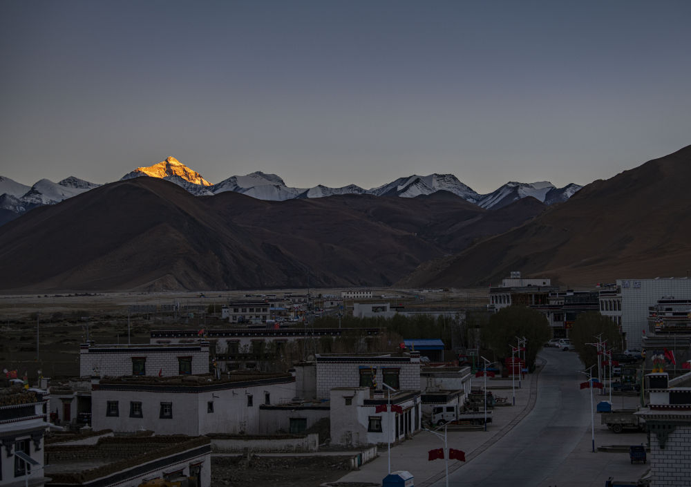 西宗乡一角,远处金色山峰为珠穆朗玛峰(5月10日摄)。新华社记者 孙非 摄