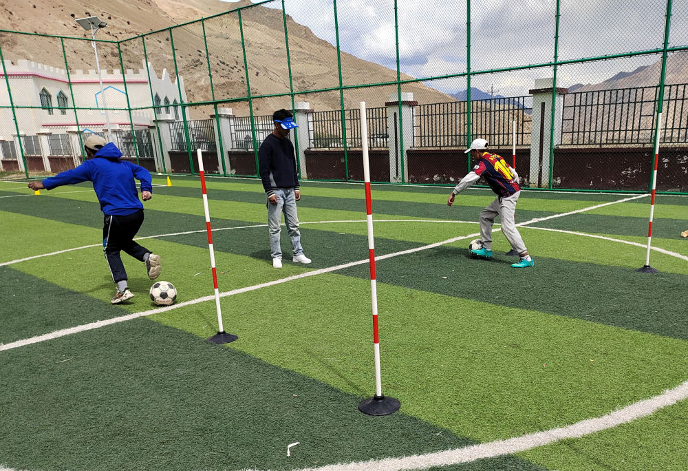 日喀则市定日县扎西宗乡完全小学的球场上,足球兴趣小组的教练普次(中)在指导学生带球绕杆(4月21日摄)。新华社发(白玛 摄)