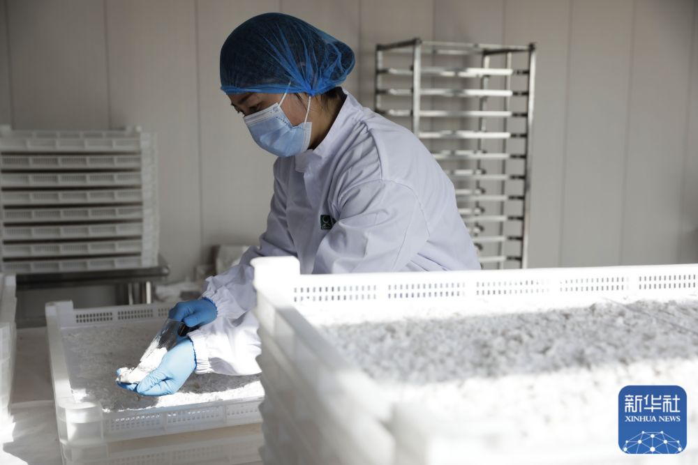 ↑11月26日,河南省武陟县一家种植专业合作社的员工对藕粉进行烘干前处理。