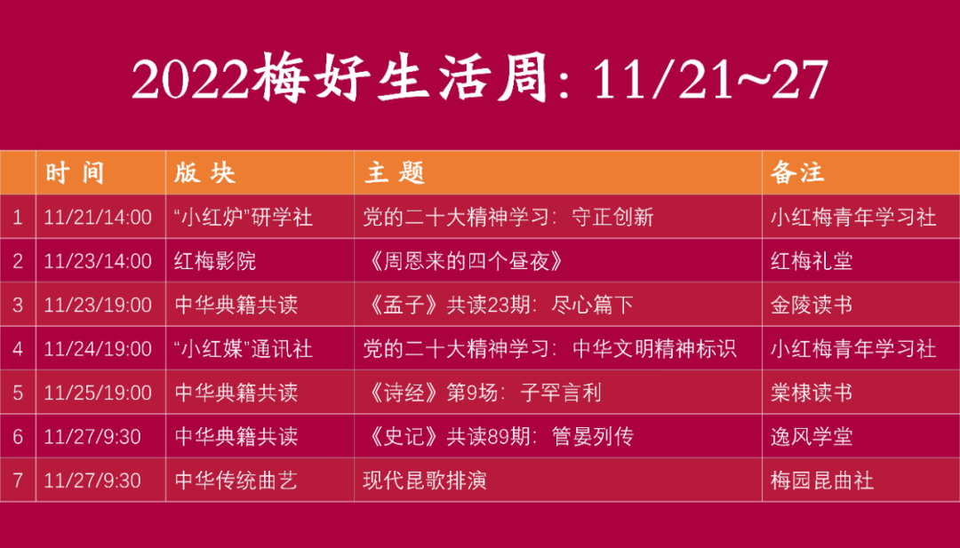 南京市玄武区“小红梅”党建阵地每周发布活动预告。图为2022年11月21日至27日学习活动的时间和主题。