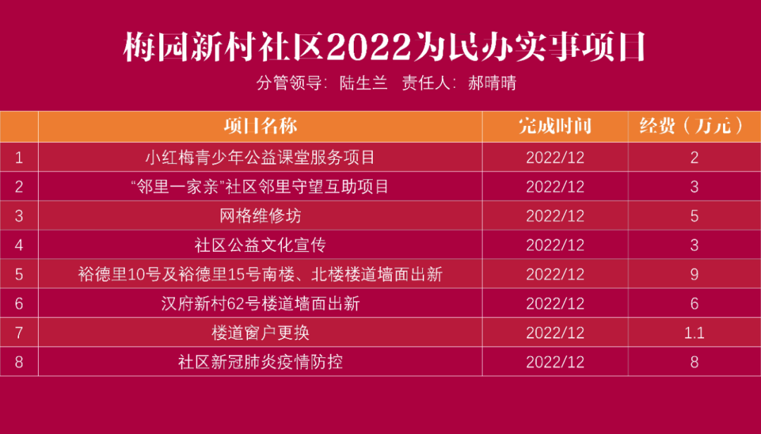 图为南京市玄武区梅园新村街道梅园新村社区2022年为民办实事项目清单。