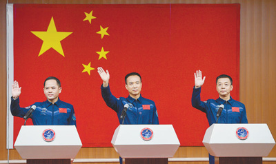 费俊龙:目前我们乘组是执行任务乘组当中平均年龄最大的,我57岁,邓清明56岁,张陆46岁。年龄虽然最大,但我们的飞行本领一直保持在青春状态。我们不忘初心、牢记使命,经过扎实、艰苦的地面训练,我们的心理更加稳定,配合也更加默契。相信在广大科技人员的密切配合下,我们一定能够行稳致远,圆满完成神舟十五号载人飞行任务。